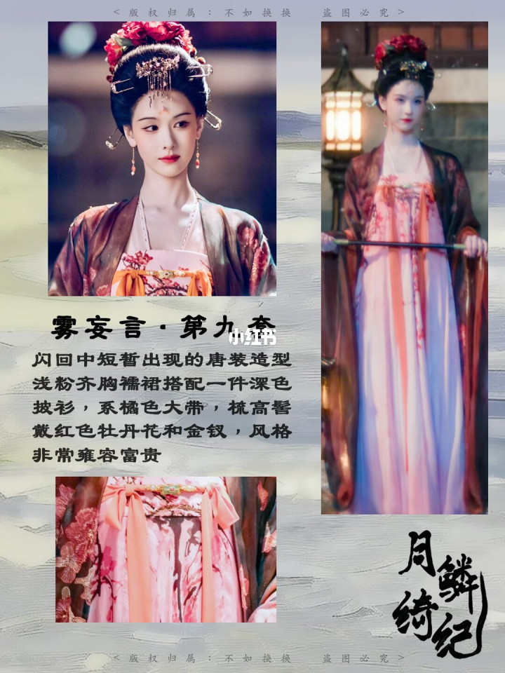 闪回中的唐装齐胸襦裙,浅粉裙身 + 深色披衫,高髻牡丹发饰,雍容华贵,尽显盛唐风韵;