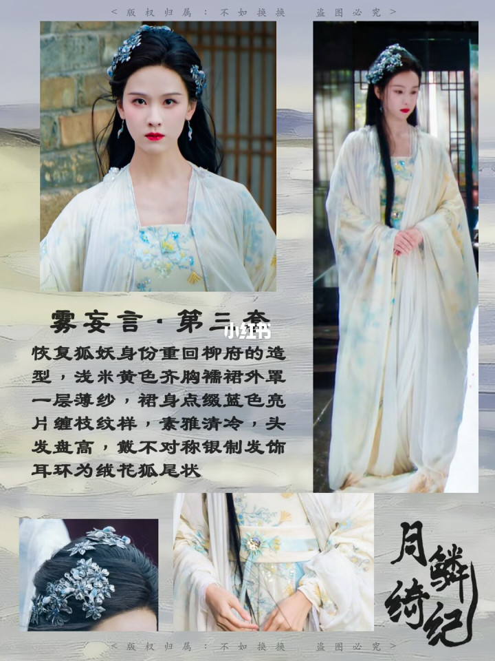 重回柳府的米黄襦裙,蓝色缠枝纹样 + 银饰发簪,素雅清冷,暗藏狐妖身份的小心思。