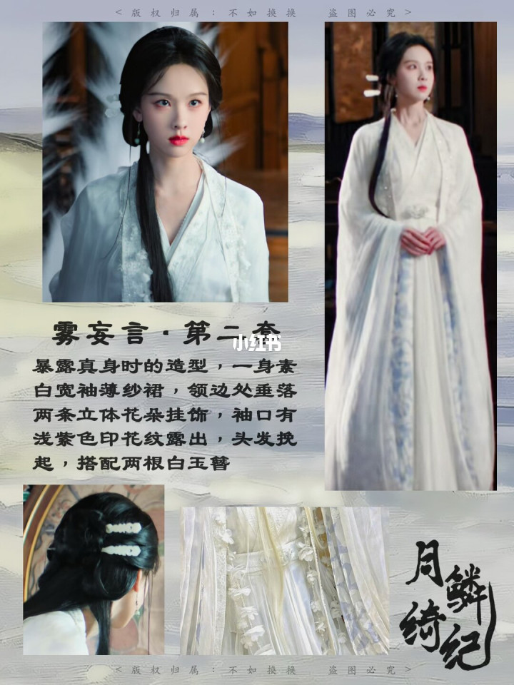 暴露真身的素白宽袖薄纱裙,领边垂落立体花朵挂饰,搭配白玉簪,清冷仙气拉满,完美诠释狐妖真身的神性;